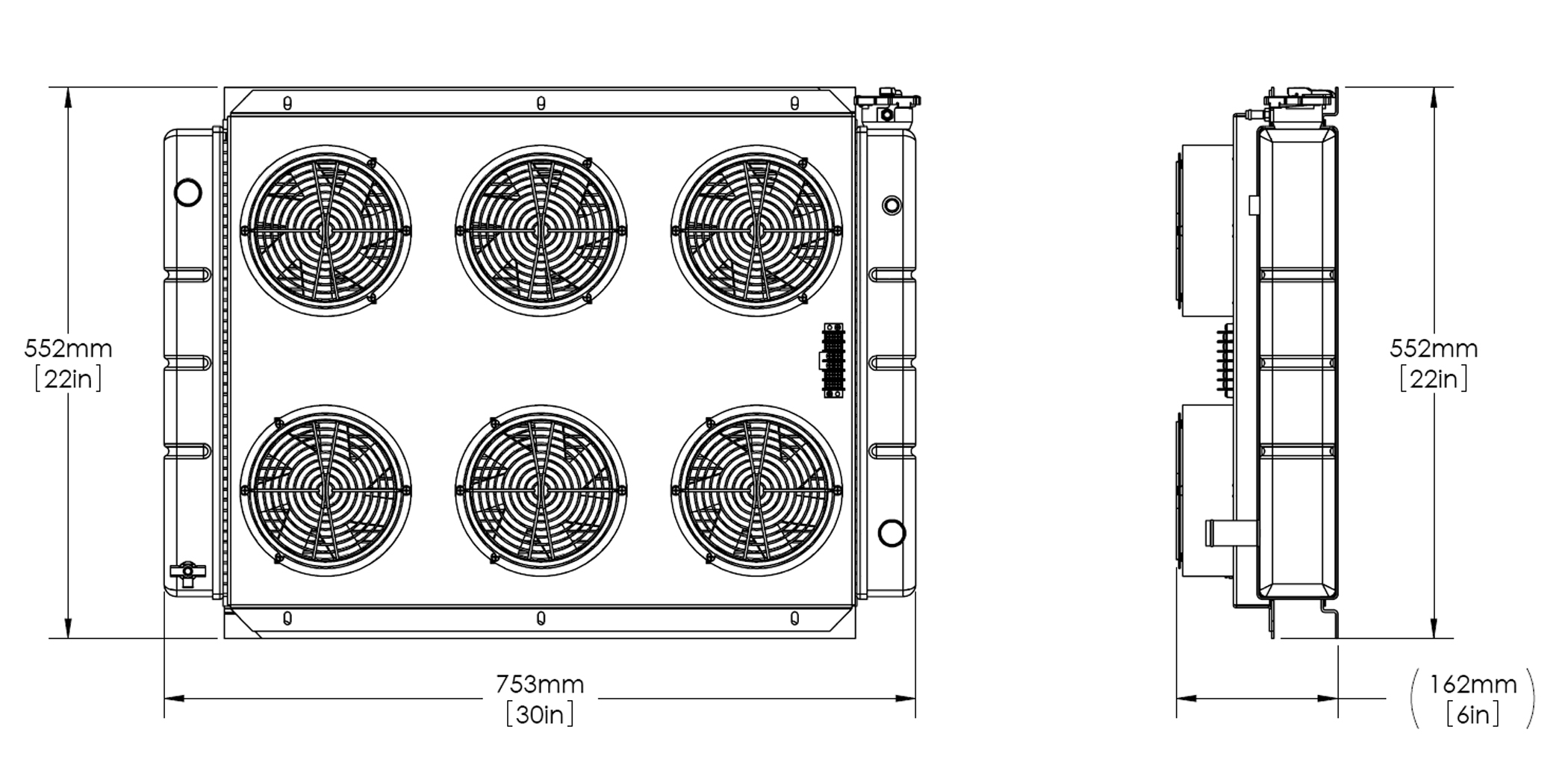 Polar’s Electric Radiator starts with a large radiator core popular in 500+ HP racing cars. We need this large radiator because our design performance will be stationary as opposed to moving 200+ kilometers per hour in a racing car. Using a large radiator minimizes the air pressure drops through the radiator, allowing the use of more efficient fans. Also with the low air velocities and low volumes of air, we need a larger radiator to compensate for lower heat exchange efficiencies.